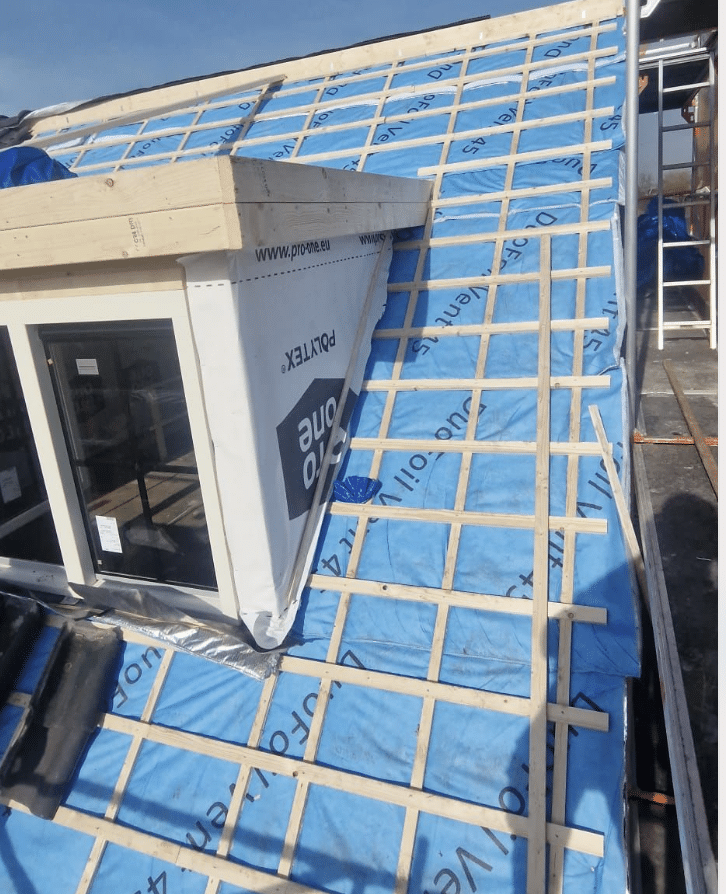 De SR40+ mag direct op het dakbeschot gemonteerd worden. Sla de dunne isolatiefolie aan de onderzijde van het dak om. Hierna kunnen de tengels, panlatten en de pannen erop. Hou rekening met de ventilatie van het pannendak op de nok met behulp van een hoekkeperband of ventilerende ondervorsten.